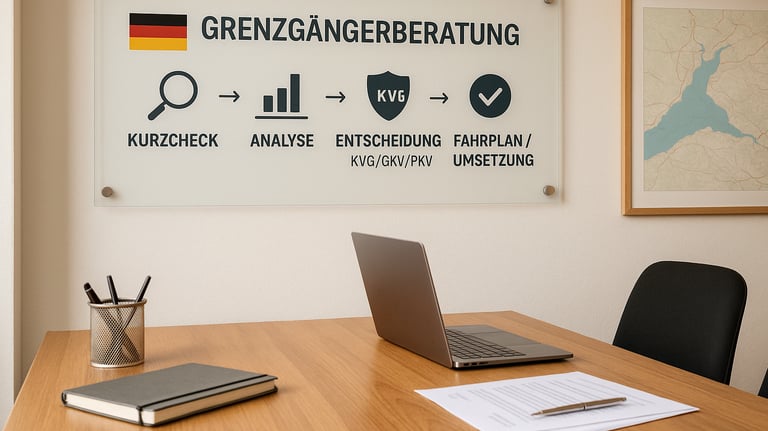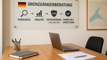 Krankenversicherung für Grenzgänger: Wahlrecht KVG vs. GKV/PKV, E106/EU-Formulare, Leistungsumfang, Beitragshöhen, Familienversicherung, Wechsel & Fristen.